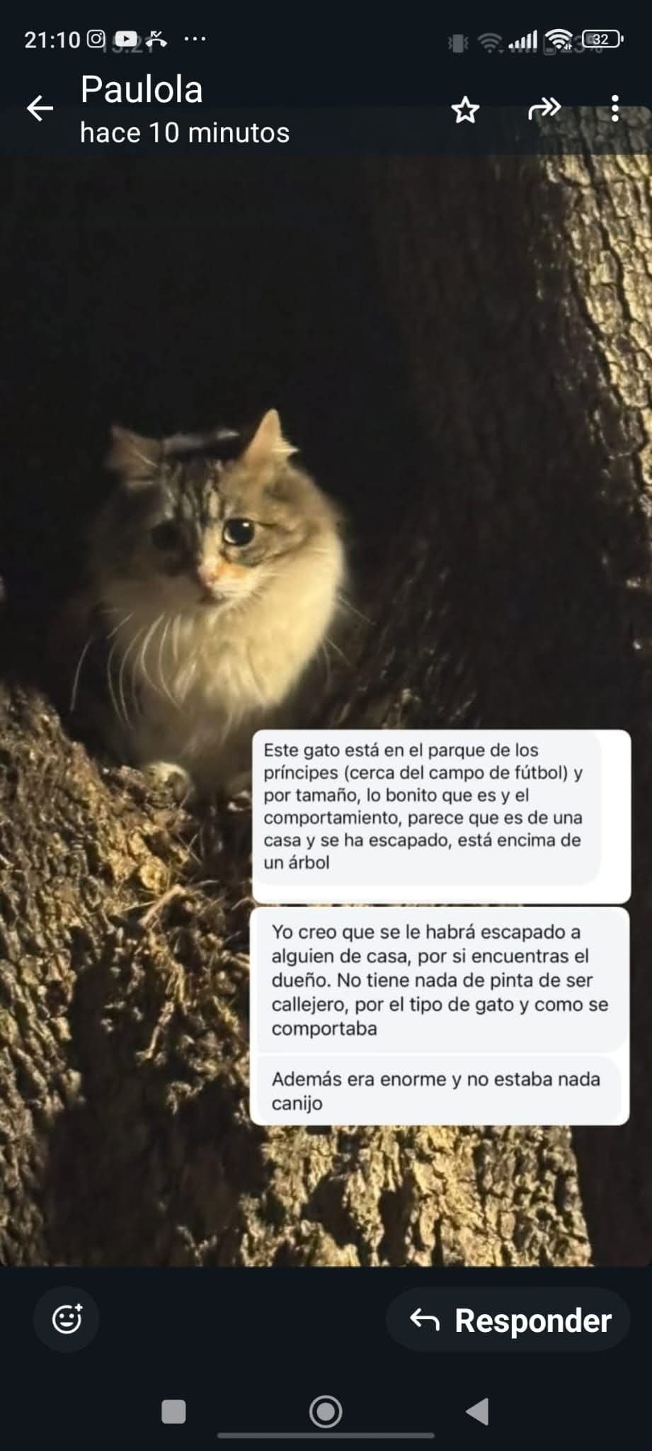 | Detalles: | Este gato está en el parque de los príncipes (cerca del campo de fútbol) y por tamaño, lo bonito que es y el comportamiento, parece que es de una casa y se ha escapado, está encima de un árbol Yo creo que se le habrá escapado a alguien de casa, por si encuentras el dueño. No tiene nada de pinta de ser callejero, por el tipo de gato y como se comportaba Además era enorme y no estaba nada canijo |