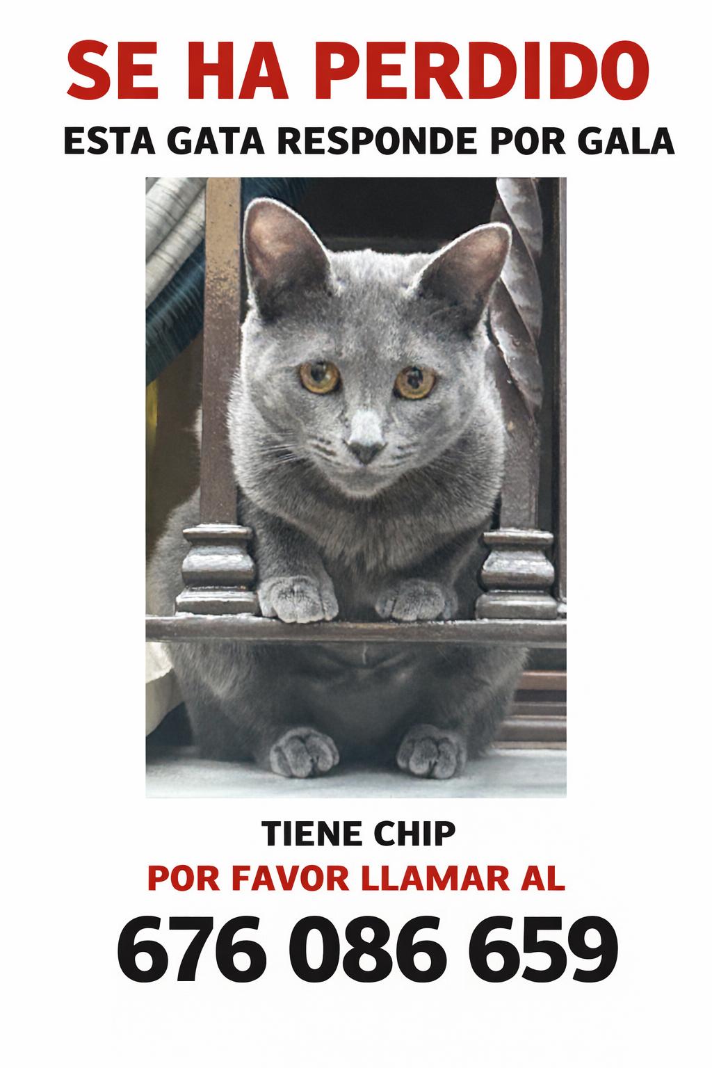 | Detalles: | Perdida hasta gris, con ojos amarillos, se podido sobre las 15 h, castrada, con chip, tiene líneas un poco más oscuras, tiene 8 meses |
