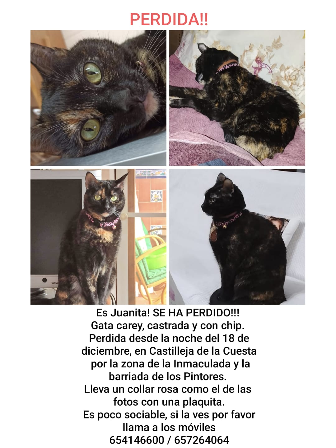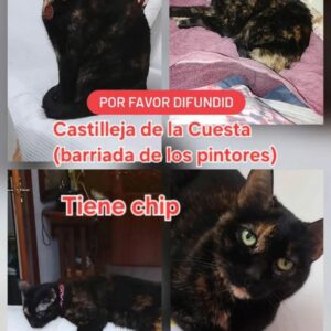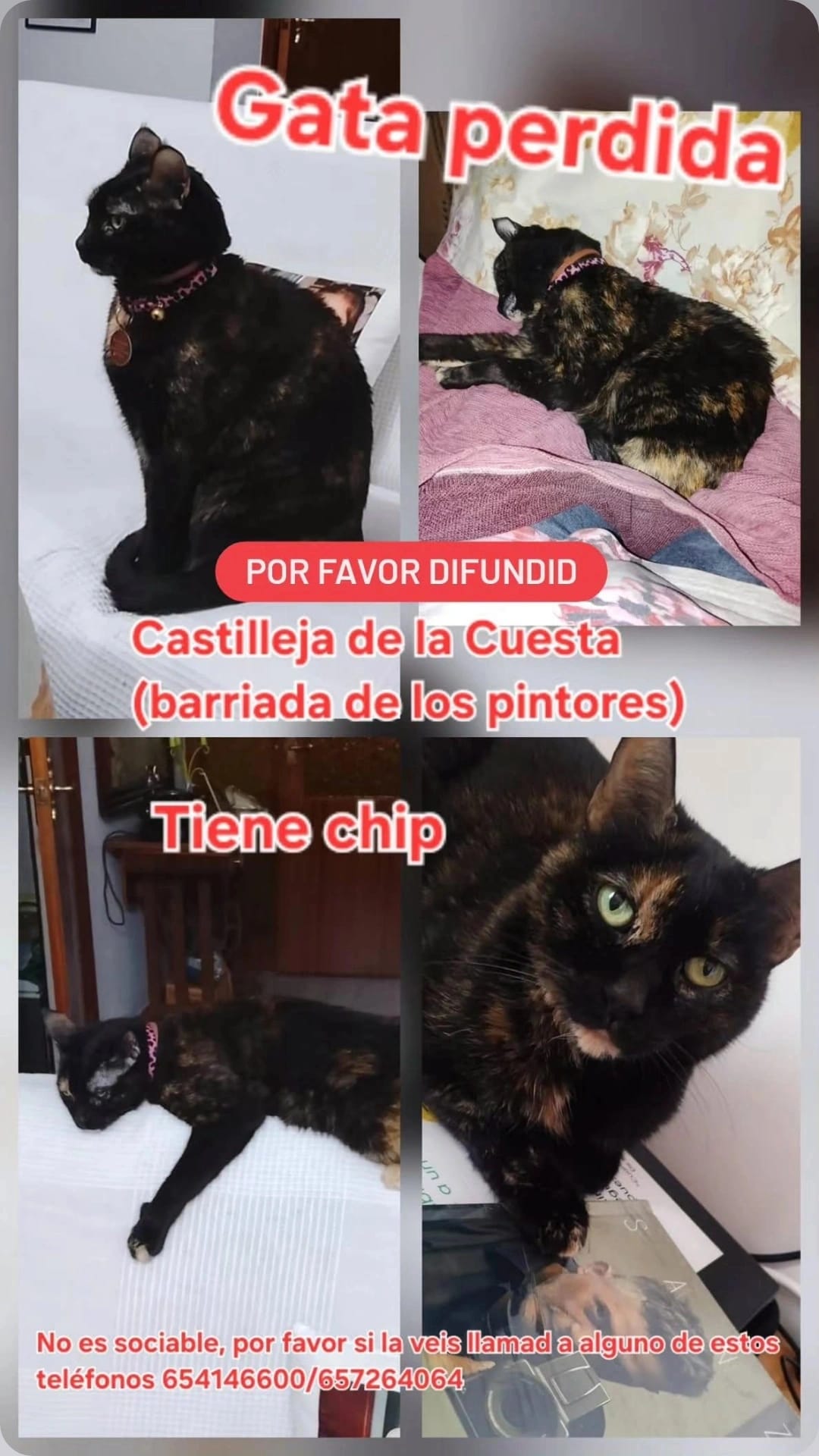 | Detalles: | Gata color carey (negra con manchas naranjas y algunas blancas) con collar rosa y chapa metálica y collar antiparasitario marrón. Perdida en la barriada de la Inmaculada. Castrada. Tiene chip. Es poco sociable, por lo que, por favor, no intentar coger. Llamar a los contactos si creeis verla y compartir la información. Gracias |