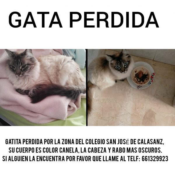 Gata perdida en agosto de 2022, es de color claro con las orejas y el rabo oscuro, tiene los ojos claros y el pelo largo.