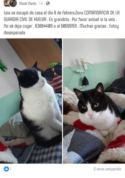 Leia se ha perdido en Huelva en el cuartel de la guardia civil,puede estar en cualquier sitio.gracias