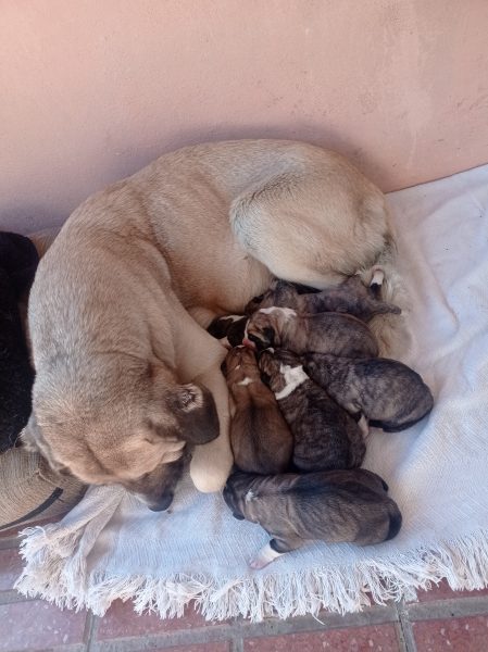 Una mastina que estaba abandonada cerca de casa, y a la cual ayudamos desde que la vimos hasta ganarnos su confianza, ha tenido 7 cachorros y necesitamos encontrarles una familia