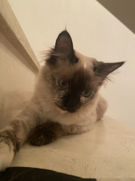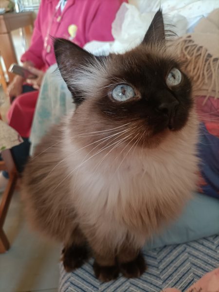 Gata de 8 meses, de colores marrón. Parece siamés pero no lo es.