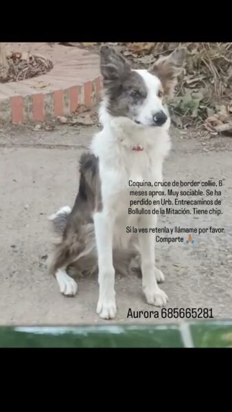 Hoy se ha perdido mi perrita. Cruce de border collie merle, muuuy sociable y simpática. Tiene unos 6 meses. Lleva un collar antiparasitario rojo. Tiene chip.