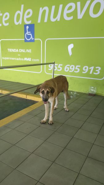 Visto mastín en Bollullos de la Mitación, parece que no es muy mayor porque tenía muy bien la dentadura. Se le ha amarrado un ratito para darle agua y comida y que no lo pillara ningún coche pero lo han tenido que soltar porque estaba nervioso. No se le veía en muy buenas condiciones, no habrá ido muy lejos.