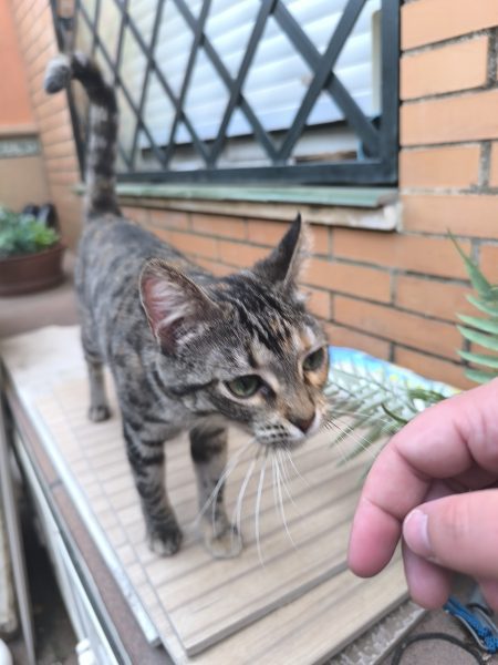 Gatita encontrada ayer noche 07/06/2025 en la calle Roble de Bormujos, es de carácter manso y muy mimosa, tiene los ojos verdes y no tiene chip, no parece que tenga más de 1 año, tiene las uñas de las patas de atrás cortadas