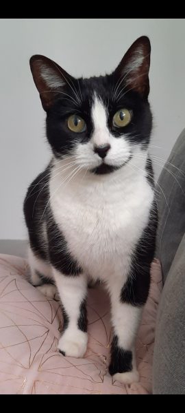 Tiene 13 años, se llama Uxue, está censada con chip en Málaga y recientemente nos acabamos de trasladar a Bormujos. Está castrada, de carácter muy bueno, pero es miedosa. De color negro, con manchas blancas y ojos verdes. Tamaño pequeñito y regordeta.