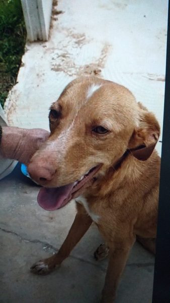 Encontrado perro macho en Autovia A4 altura Torrepalma. Llevaba collar azul, el perro parece joven, macho, mediano, marrón, educado.