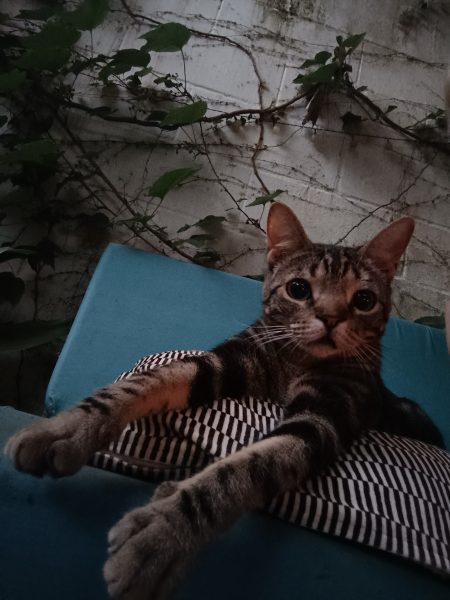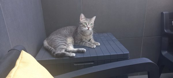 Gata atigrada muy asustadiza. Tiene chip. Sin collar.