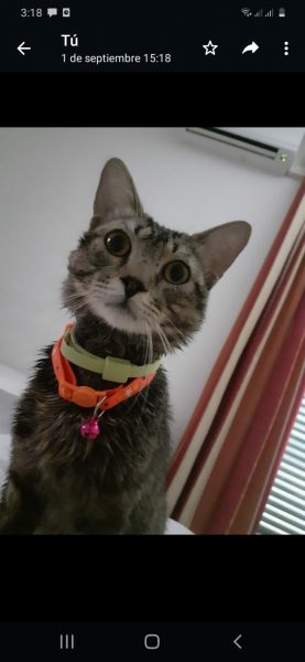 Se llama chanel es macho tiene un año y medio no está castrado no tiene chip es atigrado lleva los collares que sale en la imagen y no se deja coger almenos que sea su familia