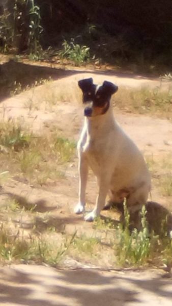 Encontrada perra bodeguera blanca con cabeza tricolor sin collar. Tiene el rabo cortado, está asustada y no se deja coger
