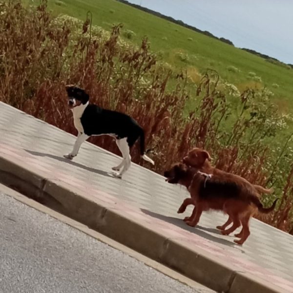 Encontrados tres perros , uno tipo bodeguero tricolor , otro negro y fuego con arnés y el tercero canela. No recogidos