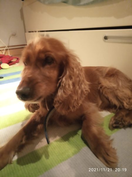 perro perdido, es un coker, lleva collar celeste y gris con adornos plateado (huesos). No es un cachorro.