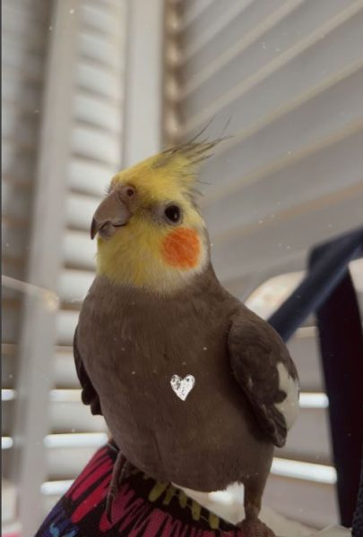 Es de color gris con la cabeza amarilla y coloretes naranja