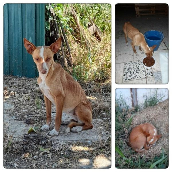 Encontrada perrita podenca canela con deditos blancos sin collar. Es joven, está famélica , se deja tocar y se encuentra hecha una rosquilla. Está en medio de la nada, sin agua ni comida. Le han dado de comer. No recogida