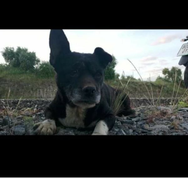 Encontrada perra abuela negra con corbata y zapatos blancos. Iba por la carretera muy cansada. Se ha recogido