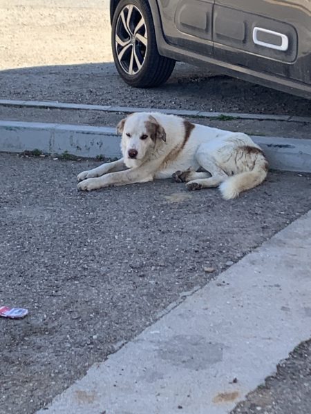 Es un mastín color blanco con manchas marrones ,está entre una venta y una gasolinera ,al lado de la carretera,no sé si es macho o hembra,pero es muy dócil