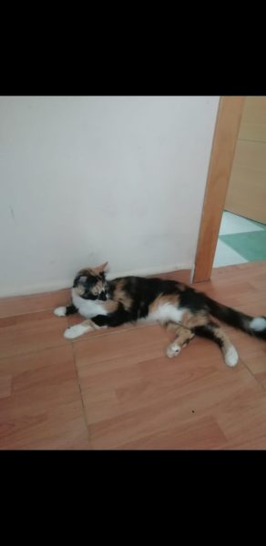 Sora, nuestra gatita Gris atigrada con vetas pardas, pelo algo largo en cola, ojos pardo amarillos y redondos, pequeña y joven, cabeza pequeña y cuerpo alargado y delgado. No suele maullar, hace ruiditos, se asusta en exterior pero sigue a las personas.