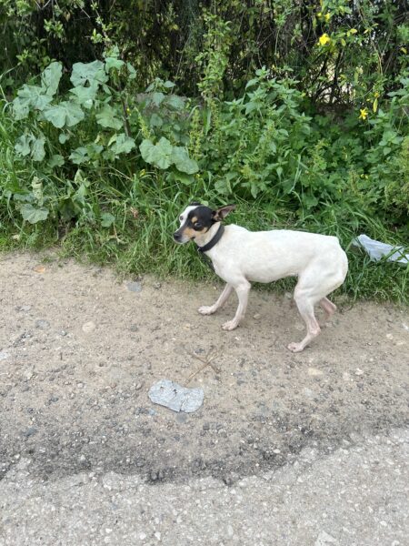 Bodeguero cachorro con colgante encontrado en Olivares, se encuentra desnutrido y desorientado