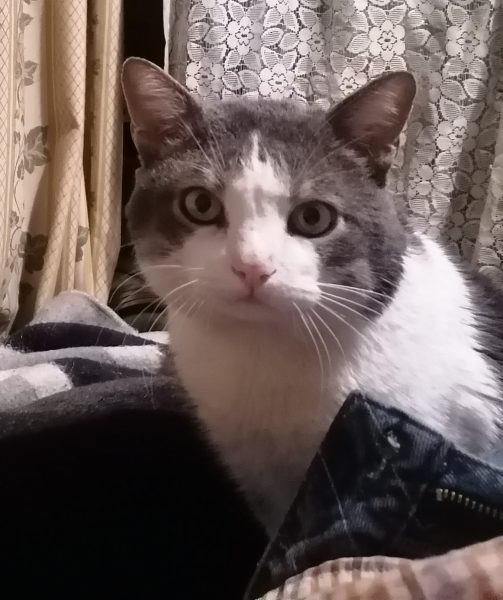 Gato adulto, gris con patas blancas y cara gris/blanca rabo muy corto, pelo sedoso. Manso, muy miedoso.