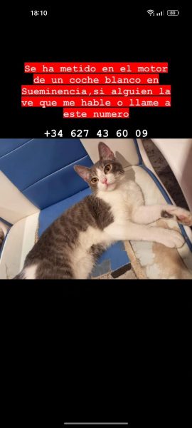 Gata mansa, castrada y con chip, responde al nombre de Margarita, es de complexión delgada, no llevaba collar, robada por la zona de calle ENCINA/PINO, no sale a la calle, suele estar en el tejado de mi patio, SIEMPRE vuelve a casa y llevo sin verla desde el miercoles 17. Si alguien la ha cogido que sepa que es una gata doméstica con familia y hermanos gatunos, necesito vuestra ayuda y un poco de empatía.