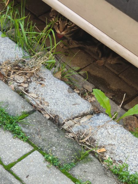 Gatito en la calle con collar parásitos y collar rojo con chapita ,creo q está perdido ,está debajo d los coches ,no se deja coger , calle burdeos ,Sevilla ,los bermejales
