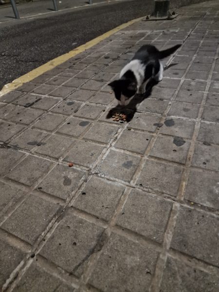 Gatito negro y blanco pequeño y solo, se encuentra en la zona de urgencias del virgen del rocío en los arbustos de urgencia y se esconde en las casetillas de al lado, no se deja coger fácil huye o se esconde. Se le ha dado de comer y agua, no recogido.