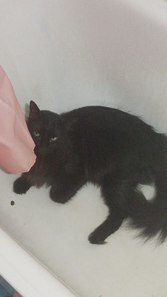 Es ciego, por eso tiene los ojos enteros negros. Muy asustadizo. Castrado y con microchip.