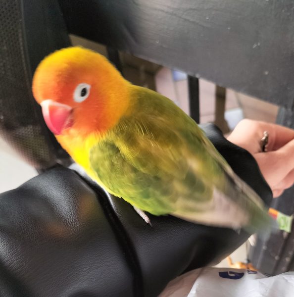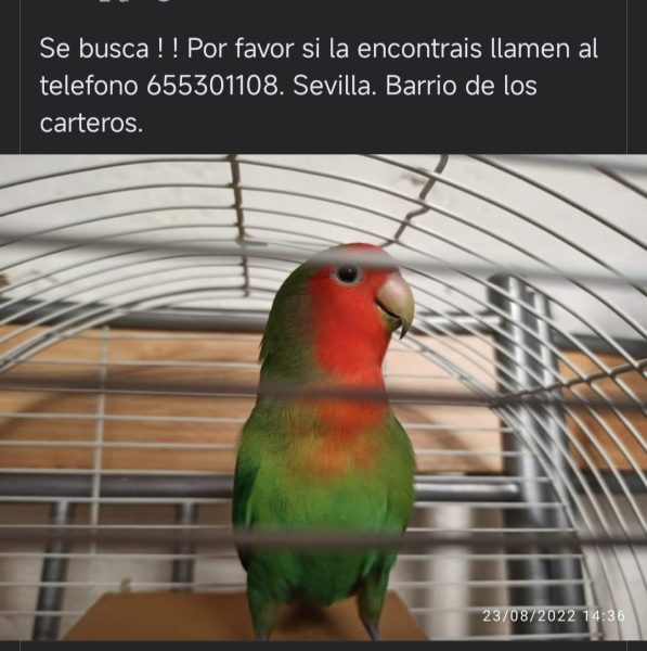 Agapornis perdido en zona Puerta Osario sobre las 12.30 del 10 de mayo. Responde al nombre de Coco y lleva anilla morada. Se sabe que se subió dentro de un taxi y el taxista se lo llevó.