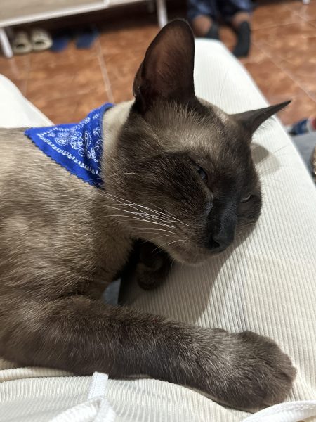 Gatito siamés de 1 año y 5 meses, responde a el nombre de malva o niño, no se deja coger con facilidad por lo que es muy nervioso pero es muy manso, llevaba puesto un collar con un pañuelo azul