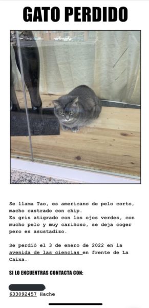 el 3 de enero se perdió el pequeñín Tao, en sevilla este, la avenida de las ciencias y lo han visto en las vallas del quinto centenario (Ciudad Verde), es gris atigrado con los ojos verde, americano de pelo corto y con chip castrado, tiene una forma peculiar de andar y es que mueve el culo como si fuera modelo, por favor si lo veis o sabéis algo habladme o contactad con el 633092457