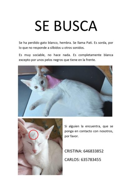Se ha perdido gato blanco, hembra. Se llama Pati. Es sorda, por lo que no responde a silbidos u otros sonidos.