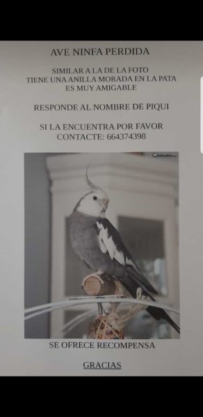 Ninfa perdida en Sevilla, en la zona de puerta Osario. Blanca y gris. Atiende al nombre de Piqui. Es amigable y se deja coger si no se asusta por sonidos fuertes o movimientos bruscos. Se ofrece recompensa. Gracias.