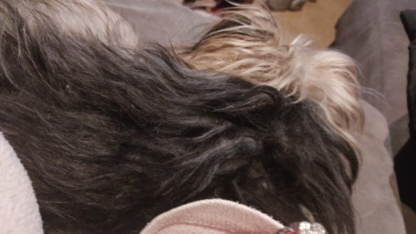 Es muy sociable, no hace nada. Es completamente blanca excepto por unos pelos negros que tiene en la frente.