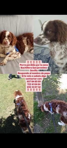 Pepe, de raza bretón mezclado con perro de agua, es adoptado, asustadizo, aún es un cachorro y en el paseo del lunes 5/05/2025 a las 13:30h se ha asustado al cruzar con una persona en silla de ruedas, se ha soltado del arnés y ha salido corriendo a las 13:30h en San Jerónimo (Sevilla). Tiene chip y ya está denunciado en la Policía. Estamos desesperados buscándolo. La última que se le vio fue la mañana del martes 6 en la carrerera dirección La Algaba. Si lo veis, por favor, llamad a los teléfonos: 657 84 85 09, 722 41 04 64, 692 33 07 32. No creo que se deje coger. Gracias!
