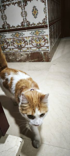 Gato naranja y blanco, no llegará al año de edad. En la cola tiene rayas naranjas.
