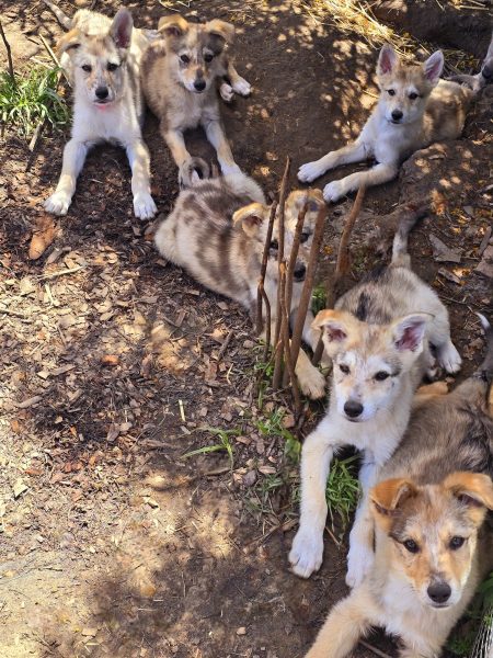 Buscamos adopción responsable para 5 cachorros Mix de Border collie con Lobo de chequia, están en Almonte, tienen 5 meses y son 4 machos y una hembra.
