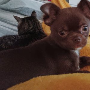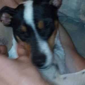 Perita pequeña hembra negra blancay marrón. Mestiza parece pero no identifico razas