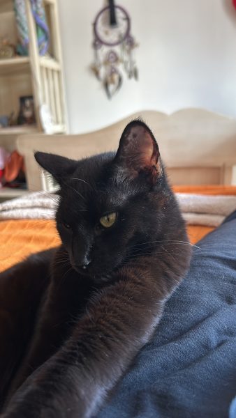 Gatita castrada de tres a años de edad se llama Daimon está castrada es negra y tiene en el hocico de nacimiento una calva