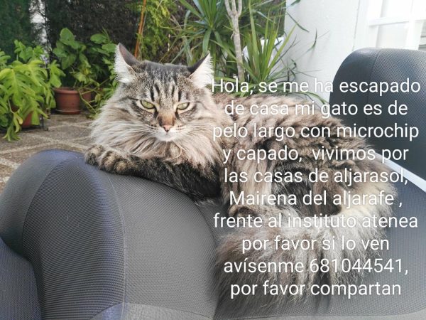 Se ha escapado nuestro gato en la noche del 11 de marzo en Mairena del Aljarafe (zona Aljarasol). Tiene 10 años, pelo atigrado semilargo (color grisáceo), macho, castrado y con chip. Nunca ha salido, se ha escapado por un fallo de las protecciones que tenemos, por lo que imaginamos que debe estar asustado o que alguien lo ha cogido.