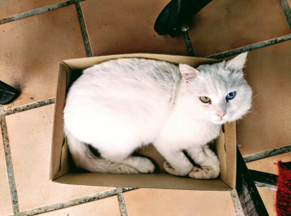 Es un gato blanco, con un ojo azul y otro verde, tiene unos 10 años y está castrado y con microchip.