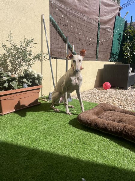 Galgo atigrado con collar martingala con estampado militar gris,visto sobre las 14:30 en el polígono la red Alcalá de Guadaira al lado de la fábrica de ruy perfumes. He intentado cogerlo pero estaba asustado se ha metido entre unas malezas y lo he perdido de vista.