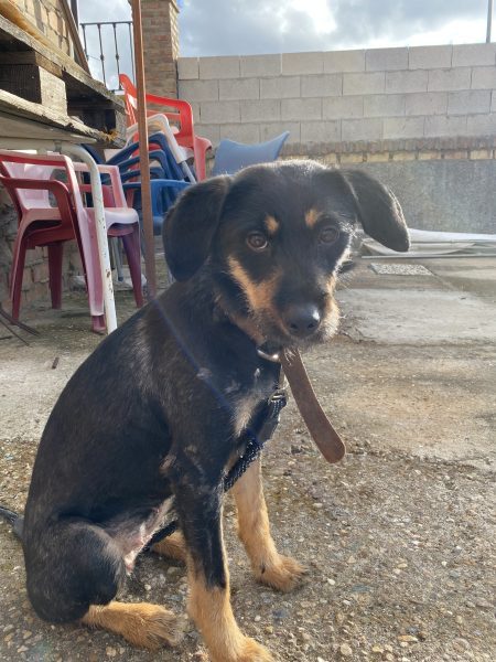 Cachorro encontrado en Bormujos. No tiene chip. Andaba solo, estaba desorientado, sediento y en peligro de cruzar la carretera. Lo hemos recogido pero no nos lo podemos quedar. Es muy bueno y tranquilo