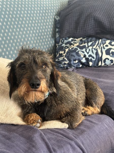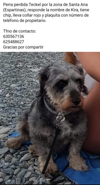 Se llama Kira, es mezcla de teckel, pelo gris, con algunas zonas con pelito marroncito y blanco como en el hocico y pecho. Tiene 11 años, pesa unos 11 kilos. Es muy asustadiza, miedosa y muy cariñosa.