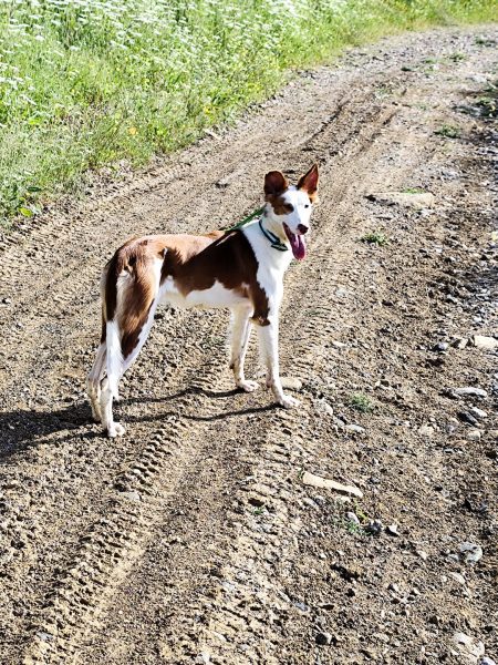 Perra podenca perdida por la zona del camino de la cantera en Burguillos.