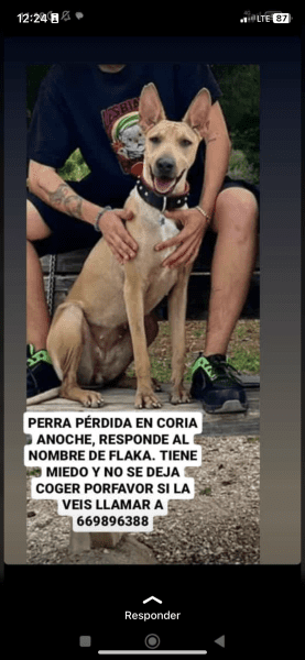 Podenco marrón macho de aproximadamente 1 año perdido a finales de Enero de 2025 en Carretera Tocina (entre Carmona y El Viso del Alcor, Sevilla – Carretera SE-3201). Se escapó pasando «PAVISO».