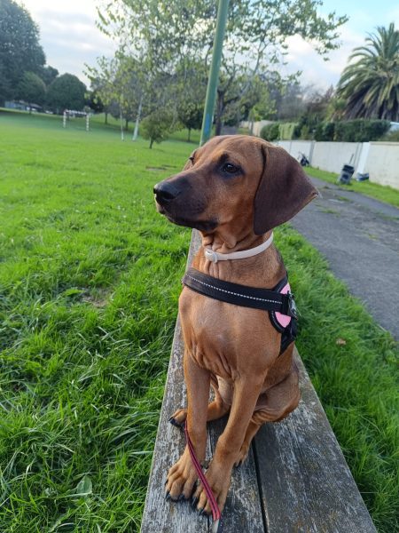Huyó muy asustada y aún no tenemos ninguna noticia de kunzita, hembra mix de sabueso de 7 meses. Llevaba arnés rosa y correa extensible roja que puede haber perdido ya y collar antiparasitario scalibor.