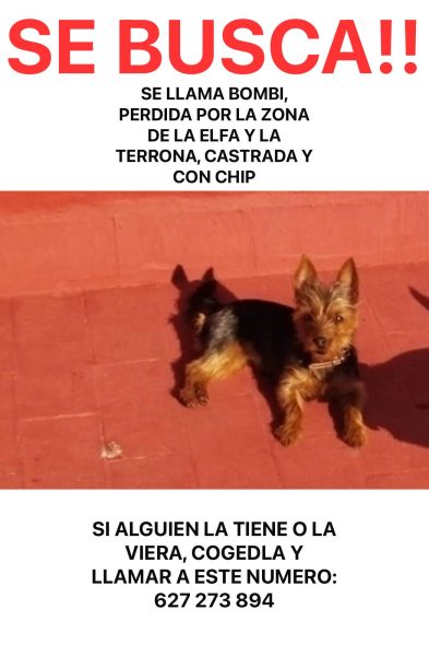 Cruce de yorkie, castrada y con chip, se llama bombi y se escapo por una extensa zona de olivos, por disparos de los cazadores, necesito ayuda y difusión