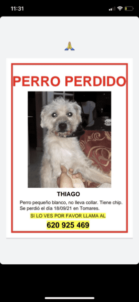 Perdido perrito blanco con chip y sin collar. Se llama Thiago tiene ocho años y lleva tres dias perdido. Podria estar por la zona de Tomares, Castilleja de la Cuesta, Castilleja de guzman..