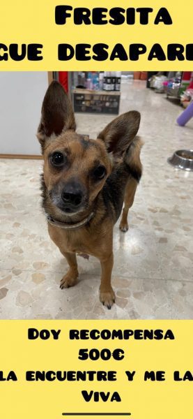 Perrita pequeña de color canela, mezcla de podenco con algo, extramadamente cariñosa. En los jardines del Valle, cerca de la Iglesia de los Gitanos se ha perdido.